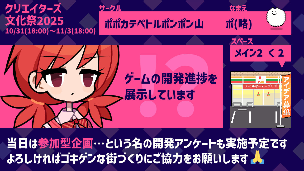 このイベントは時間がなかったので無念のオール過去絵再利用😔どうも普通のサークルはおしながきや設営を毎回描きおろしたりしないらしいです。